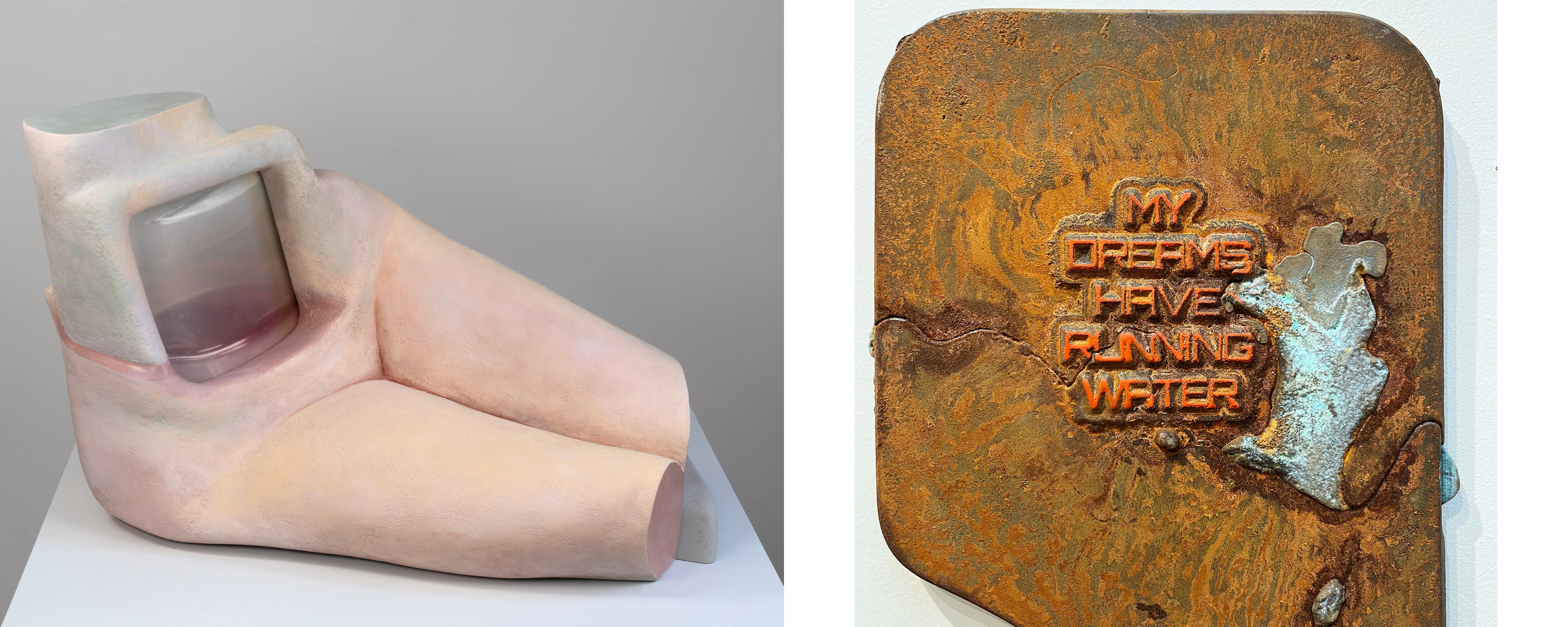Left: "Declining Nude (with Basin, Prop, and Handle)," Ellie Krakow, aquaresin, fiberglass, foam, wood, epoxy clay, acrylic paint, photograph printed on aluminum, 18 x 29 x 16.5 inches, 2025